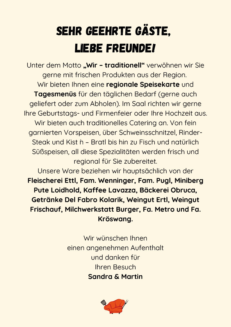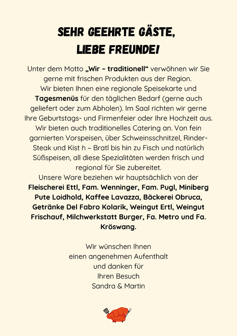 Kommen Sie bei uns vorbei und lassen Sie sich mit unseren regionalen Speisen verwöhnen! Wir freuen uns auf Ihren Besuch!